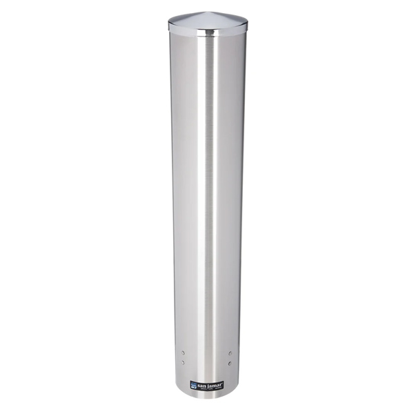 The San Jamar C4400PF pull-type cup dispenser is constructed of strong stainless steel for rust resistance. Cups load from the top to simplify refill, and gravity pulls the cups toward the opening in the bottom. The dispenser accepts cups with a 12-ounce to 24-ounce capacity, and these cups have a rim diameter between 31⁄4 and 37⁄8 inches.