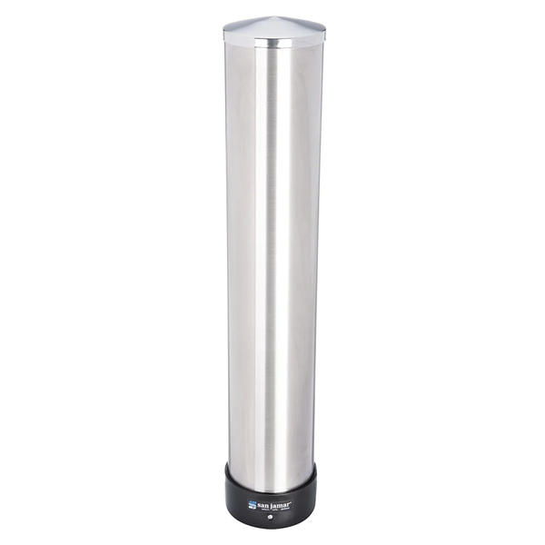 This San Jamar cup dispenser includes an adjustable collar, which accommodates cup rims that are 234 to 378 inches in diameter. The C3400P is designed for plastic, paper, and foam cups with capacities ranging from 12 to 24 ounces. Constructed from durable stainless steel, this cup dispenser is equipped with brackets for easy wall-mounting.